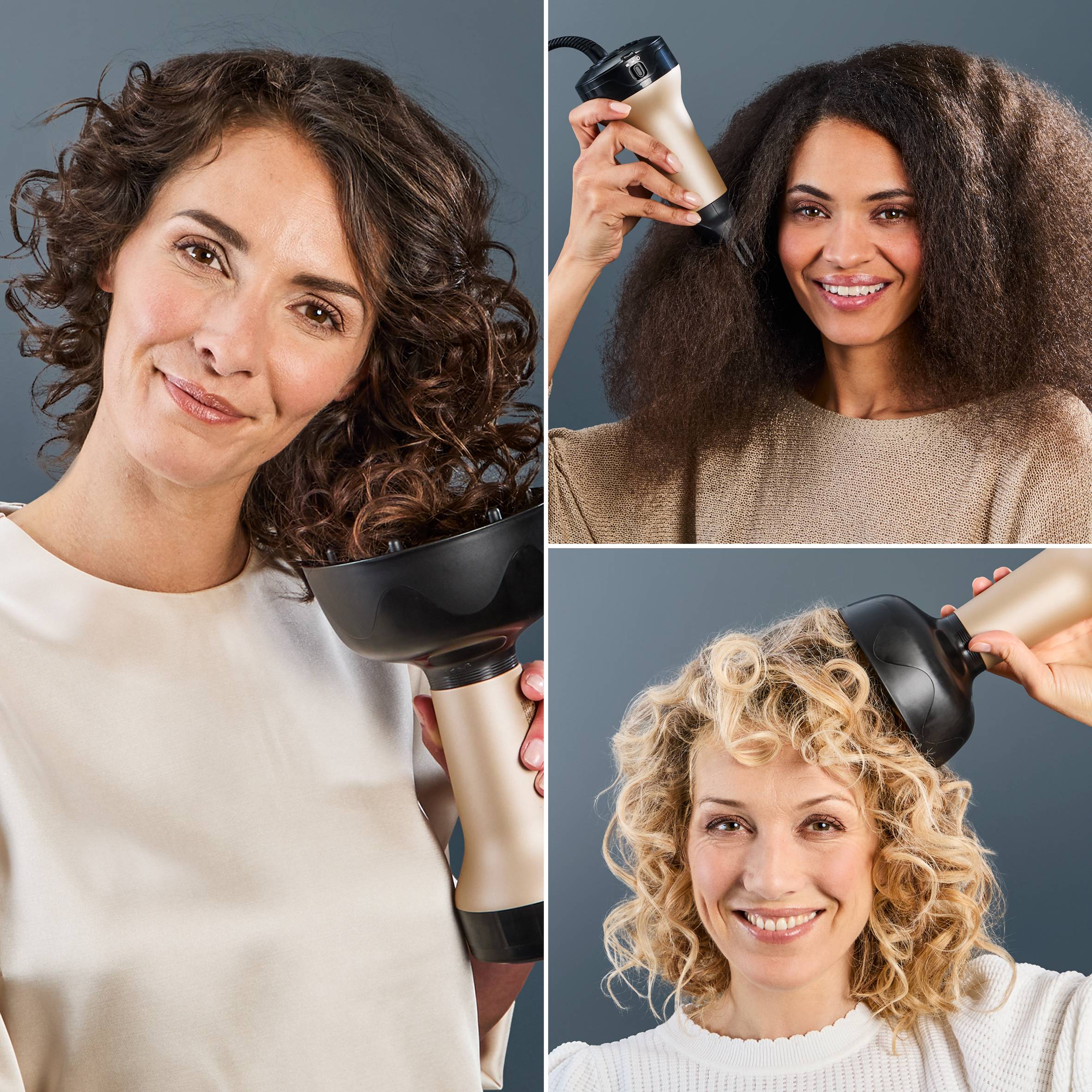 Seque, redefina e realce a forma natural dos seus caracóis com uma modelação 3 em 1 para cabelo encaracolado, crespo e com textura. Difusor de ar quente com definições ideais para cabelo encaracolado/frisado e fluxo de ar suave para uma sensação de secagem natural. Difusor XL: Secagem mais rápida para 80% das mulheres* com fluxo de ar suave para caracóis definidos, mais elásticos, macios e brilhantes. Difusor para raízes: Cerdas macias extra longas levantam e secam as raízes sem frisado, para caracóis definidos da raiz às pontas. Pente de dentes largos: Suaviza e reduz o volume dos caracóis, perfeito para preparar o cabelo crespo para a modelação e obter um resultado naturalmente suave. Design ergonómico e leve, com 93% das mulheres a afirmar que facilita a secagem*. Bolsa de arrumação elegante, prática e pronta para viajar, para manter o seu penteado impecável onde quer que vá.