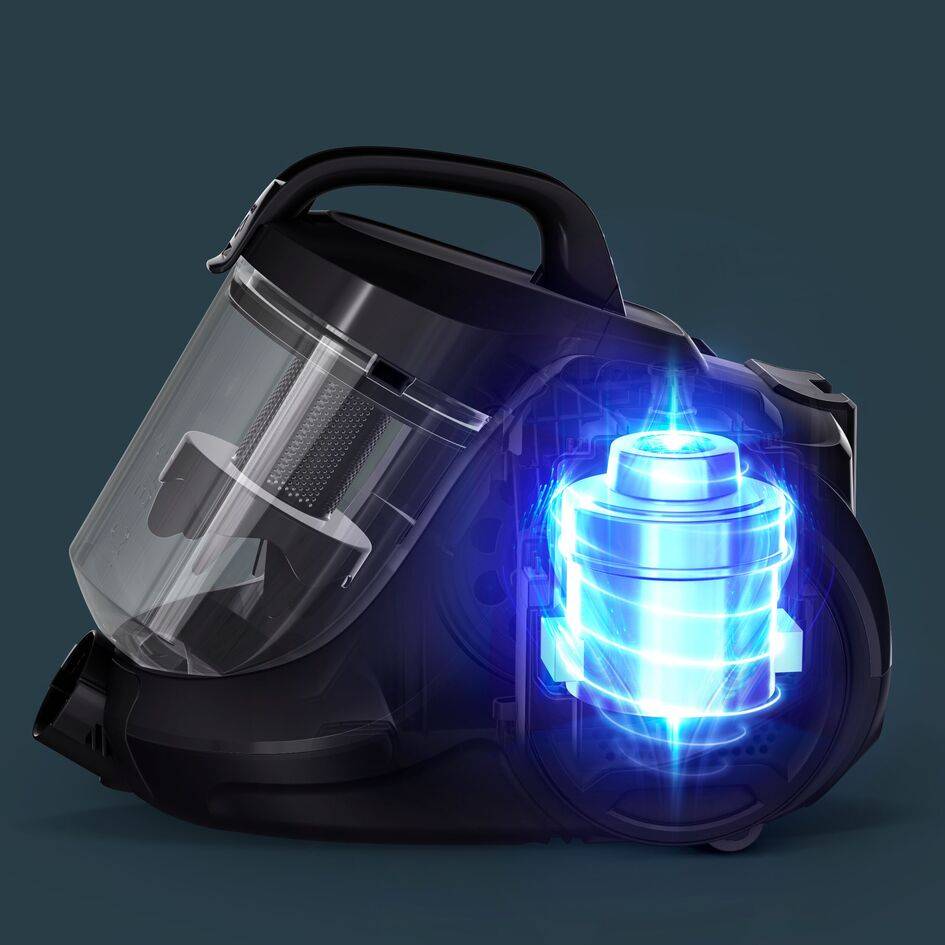 Aspirador sem saco de alta performance equipado com um potente motor de 900 W de baixo consumo máximo**. Design ultracompacto e pega ergonómica para fácil transporte e armazenamento; Filtragem em 3 níveis que filtra mais de 99,98% das partículas de pó para um ambiente puro; Grande cobertura de superfície para total conforto e comodidade; 15 anos de reparabilidade a um preço justo; Depósito de pó fácil de esvaziar e que evita aberturas acidentais.